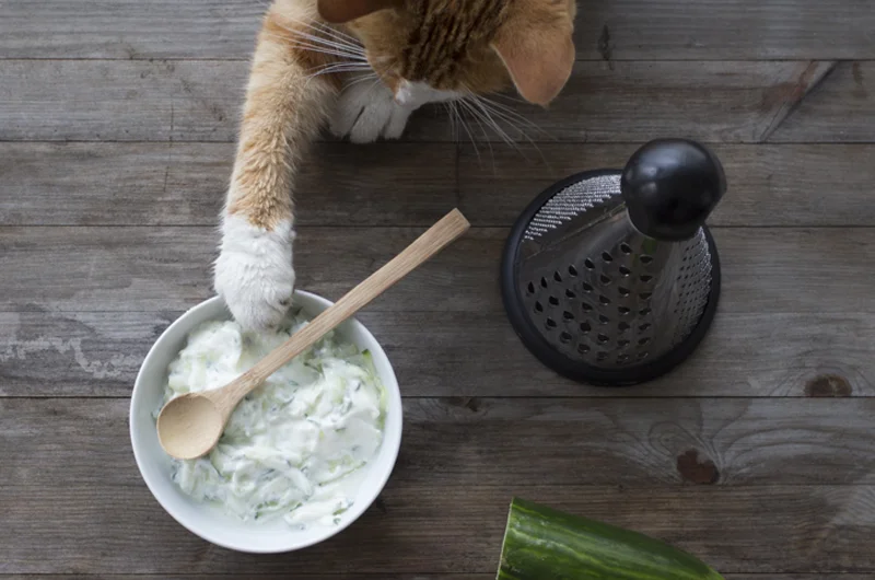 På det tidspunktet hadde jeg enda ikke begynt med lavFODMAP dietten, men merket ganske tydelig at løken, hvitløken og pitabrødet ikke var noe for min mage. Denne helgen forsøkte jeg å gjenskape denne gyrosen, men i en magevennlig variant. Ikke bare synes jeg at denne ble svært god, men det syntes tydeligvis også min katt Joseph som så sitt snitt til å smake på Tzazikien akkurat i det jeg skulle ta bilde av den.