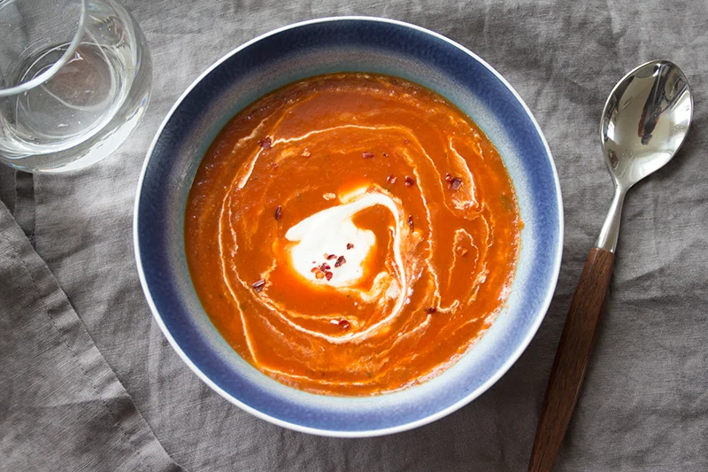 Middag: Krydret tomatsuppe, server gjerne med kokte egg i og ostesmørbrød ved siden av.