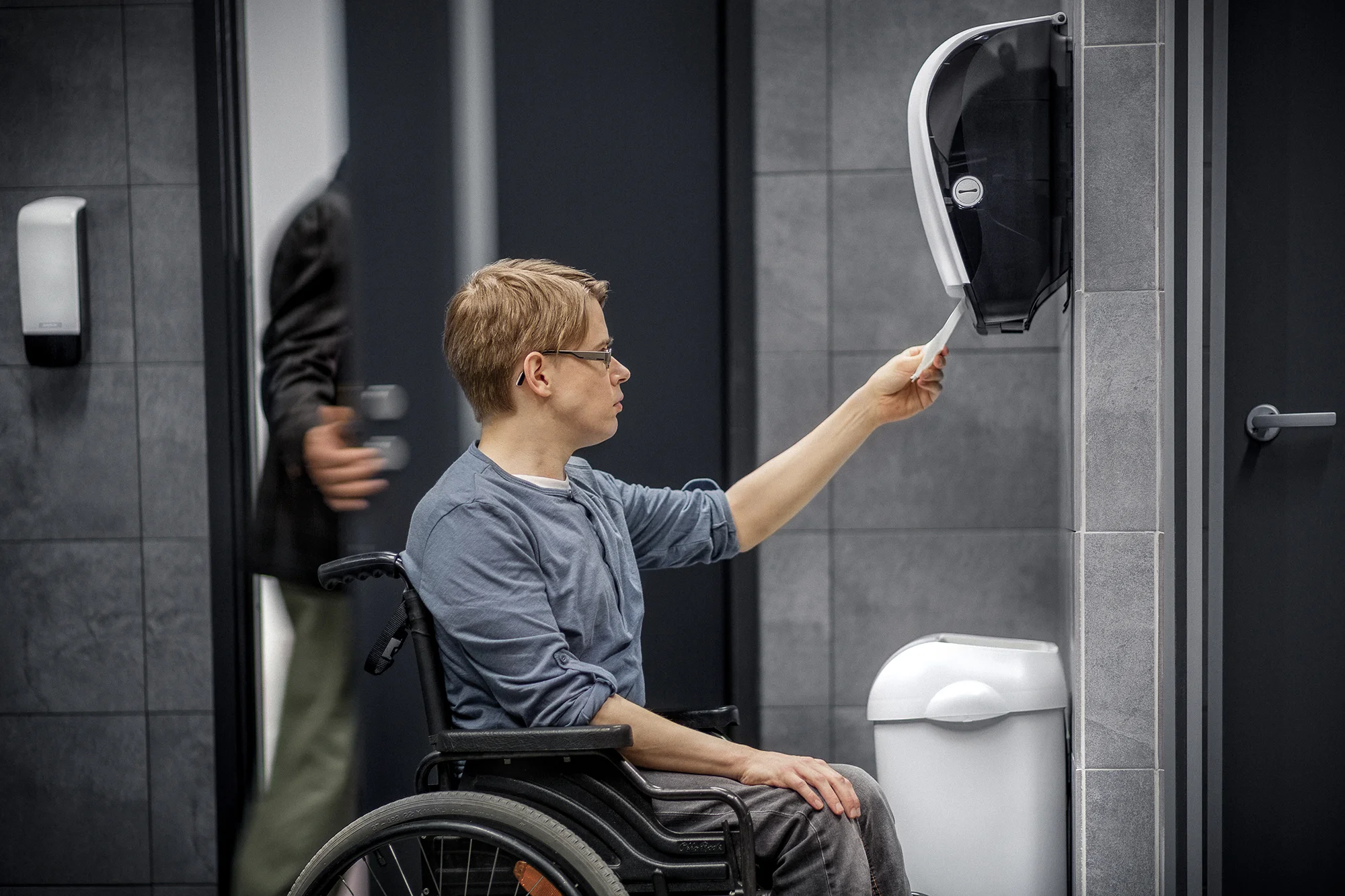 Firmaet Metsä Tissue har laget sine dispensere med tanke på at alle enkelt skal kunne bruke dem, og de har fått hjelp til å utvikle sine produkter fra både blinde, svaksynte, folk som sitter i rullestol, folk med leddgikt samt barn, renholdsarbeidere og ledere.
