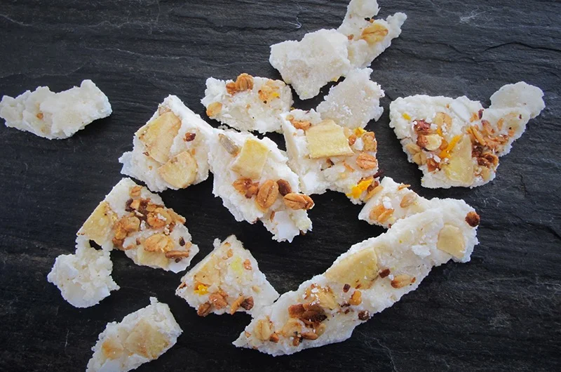 Når snacksen har blitt stiv, løfter du den forsiktig av bakepapiret og deler den i ønskede biter. Smaker himmelsk både som snacks på kvelden når man er fysen på noe søtt, som et raskt mellommåltid eller til å ta med seg som vertinnegaver om man skal bort.